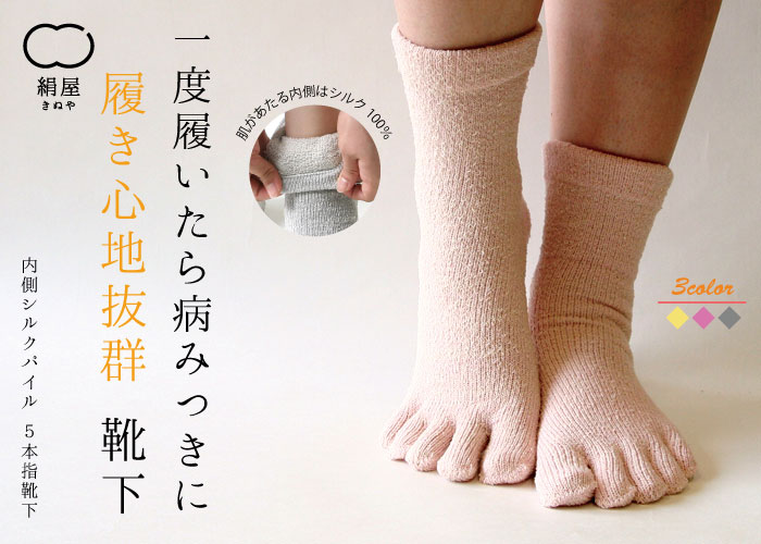 内側シルク パイル 5本指 靴下 レディース 女性用 靴下 くつした ソックス 温活 冷え取り 絹屋 日本製 ギフト プレゼント 敬老の日