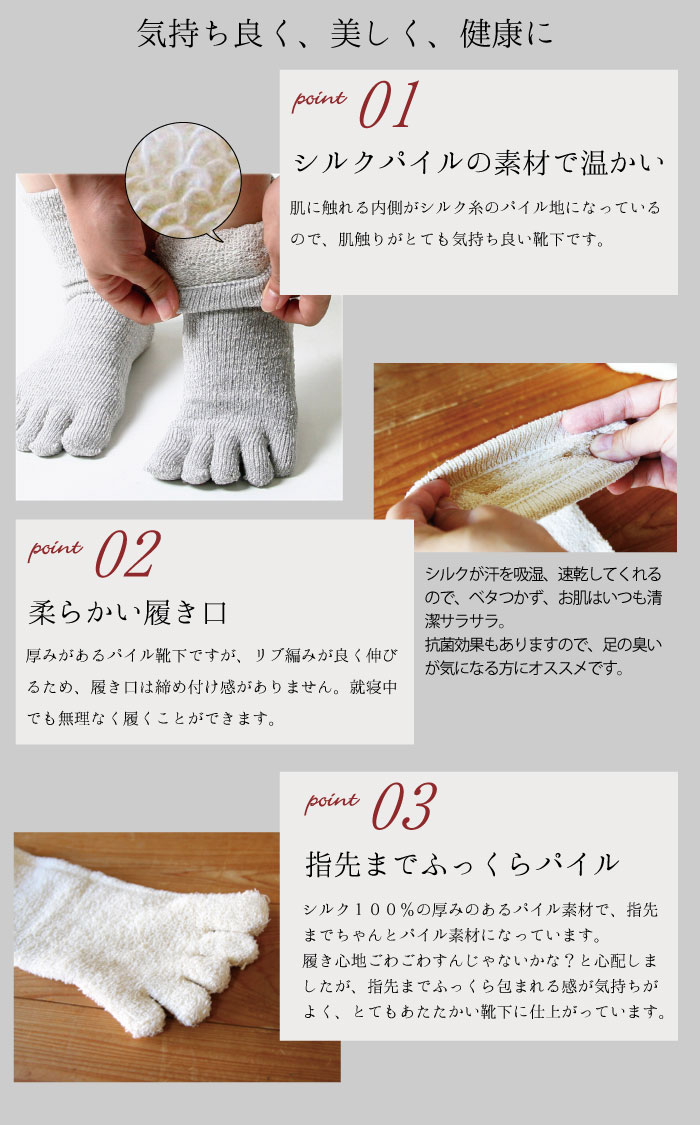 こちらの商品は 1配送 につき 2点 まで ネコポス可 ネコポスについて詳しくはこちら人気のシルクパイル靴下から5本指靴下が登場です。
