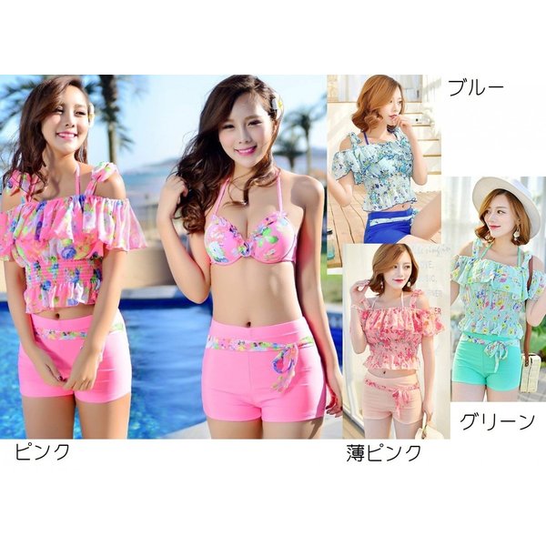 スーパーSALE期間限定!10%oOFF レディース 水着 タンキニ セット オフショルダー ふんわりカバーアップ フリル ショートパンツ ボクサーパンツ 3点セット