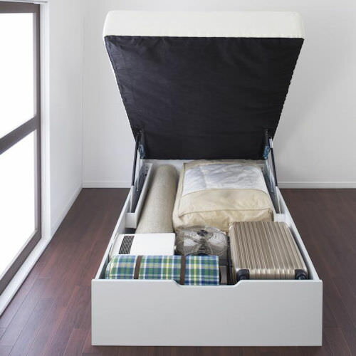 マットレスと床板が一体となった跳ね上げタイプの収納ベッドです。